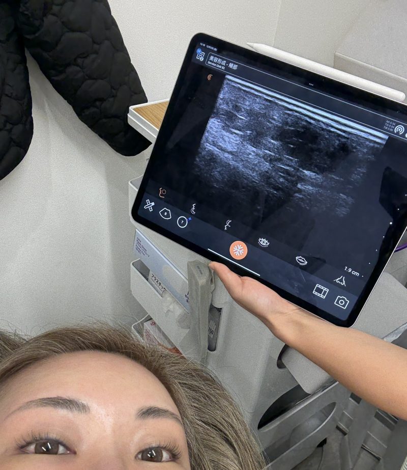 あと、最初にお邪魔したときにヒト由来のヒアルロニダーゼ扱ってるのを見て、ペイジレップで入れたほうれい線横のヒアルを溶かしてもらった。(これもエコーでヒアルロン酸の位置確認しながらやってくれる)